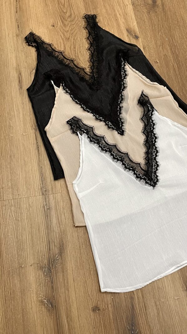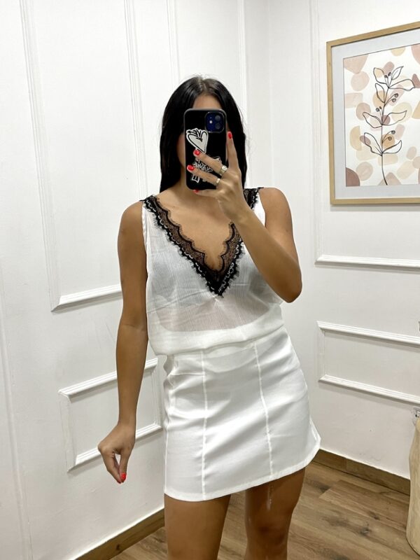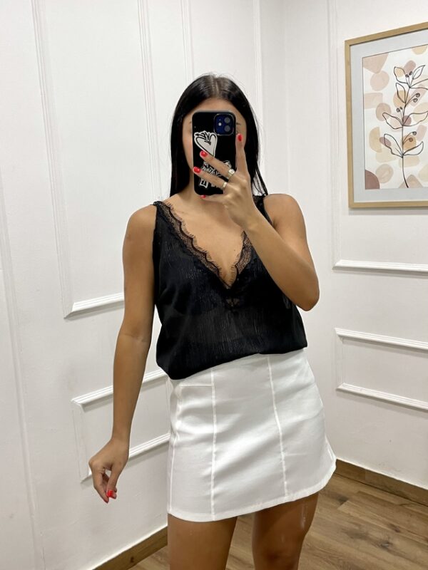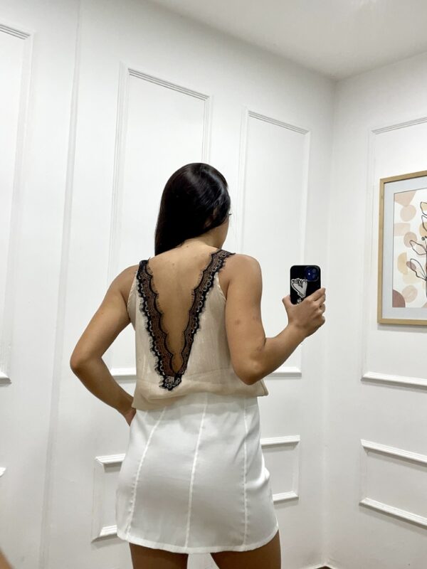 Blusa de gasa con lurex, escote y espalda descubierta con encaje negro.