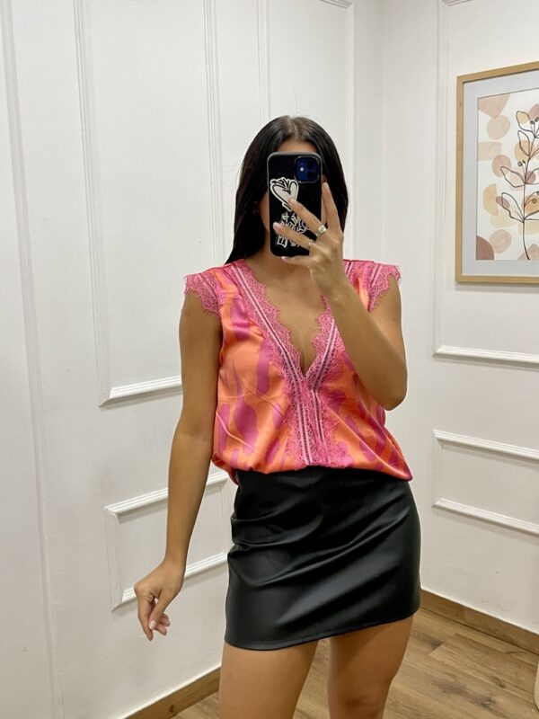 Blusa de seda estampada con puntilla en el cuello y en los hombros.