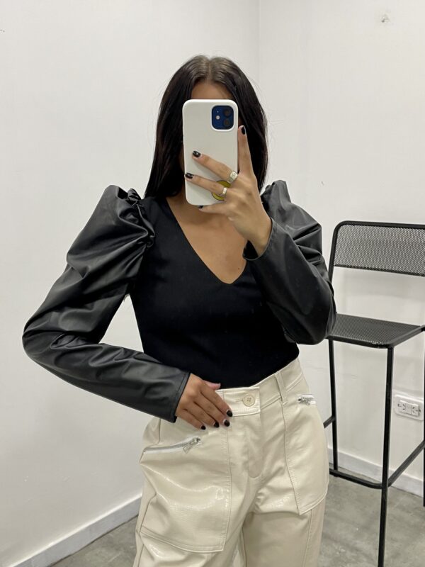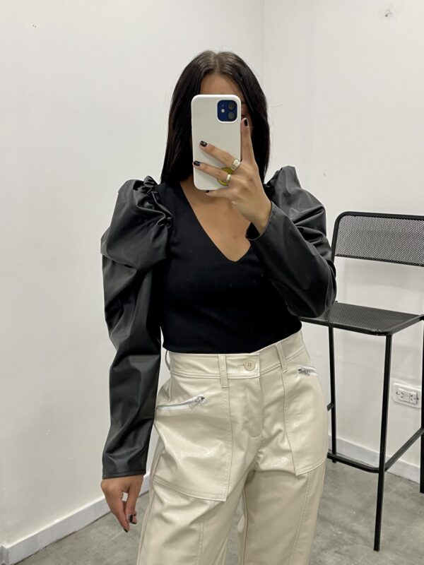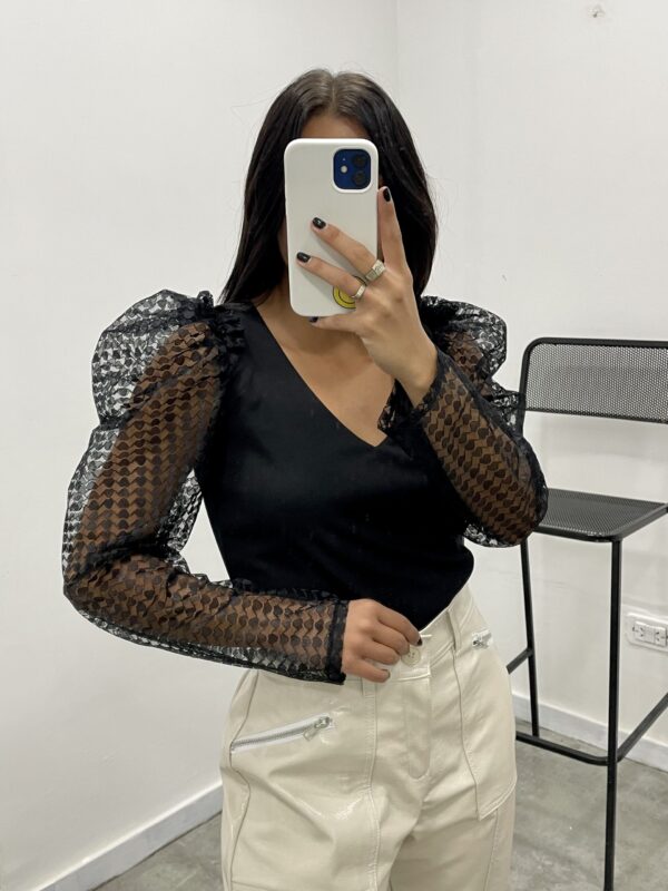 Blusa de morley con cuello en V y mangas princesa de tul con corazones o eco cuero.