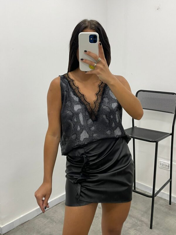 Blusa de tela con textura de serpiente y lurex, escote en el frente y en la espalda con puntilla.