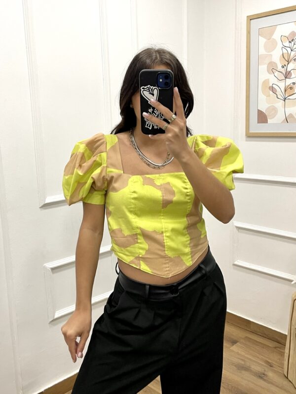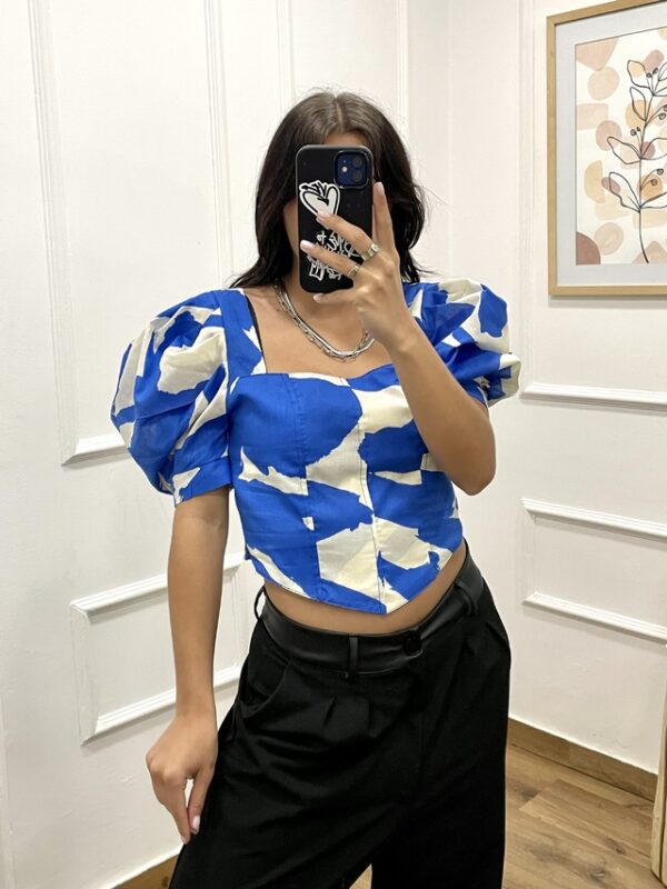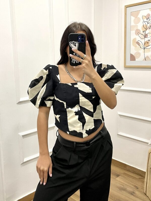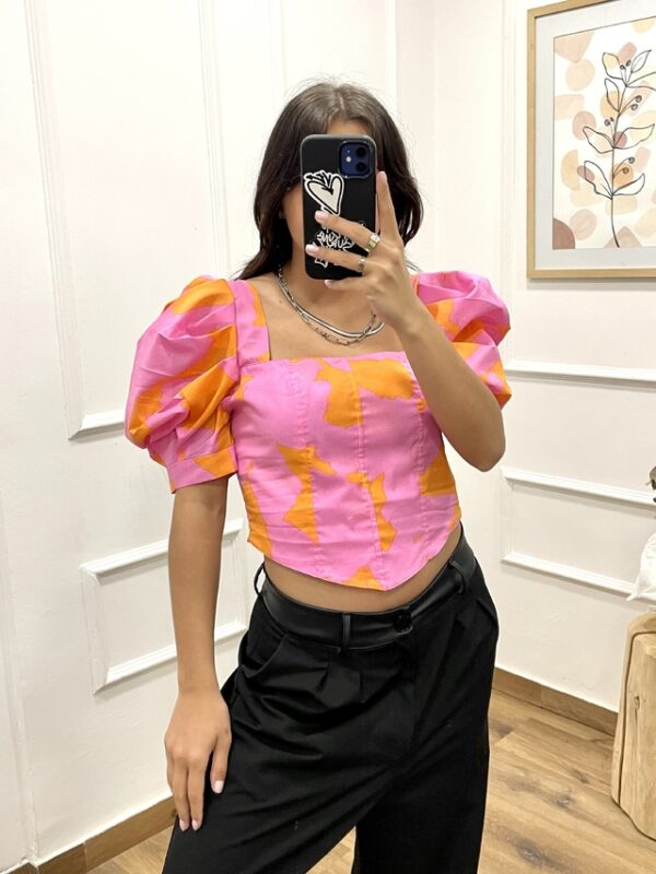 Blusa de fibrana estampada con escote recto, terminaciones de Corset y mangas princesa.