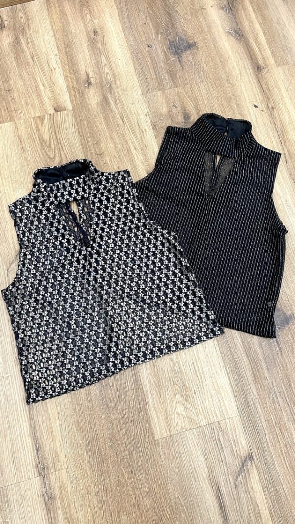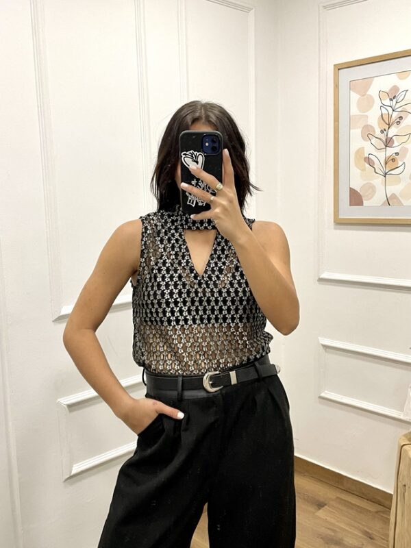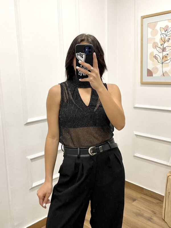 Blusa con transparencia, escote en V y cuello alto.
