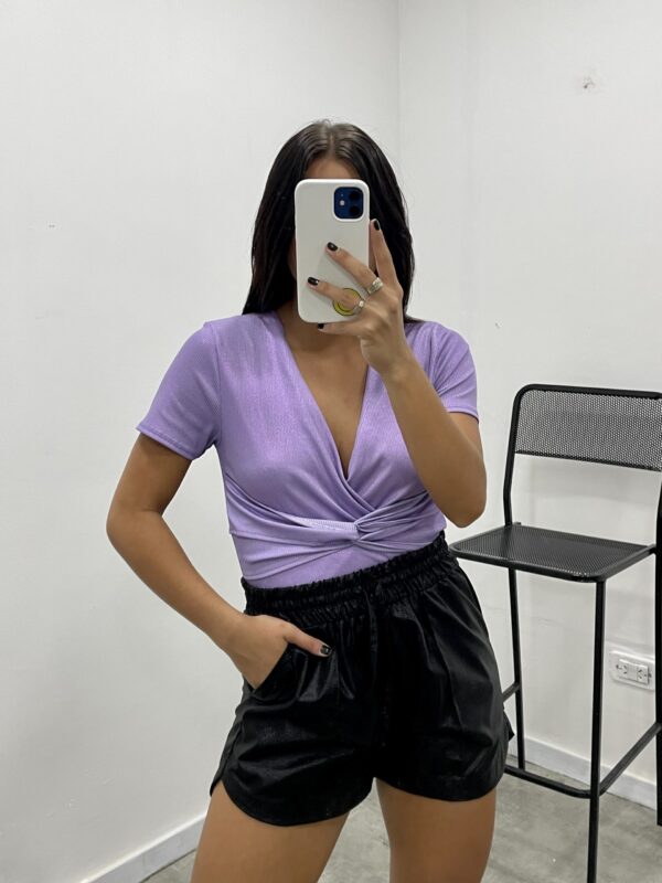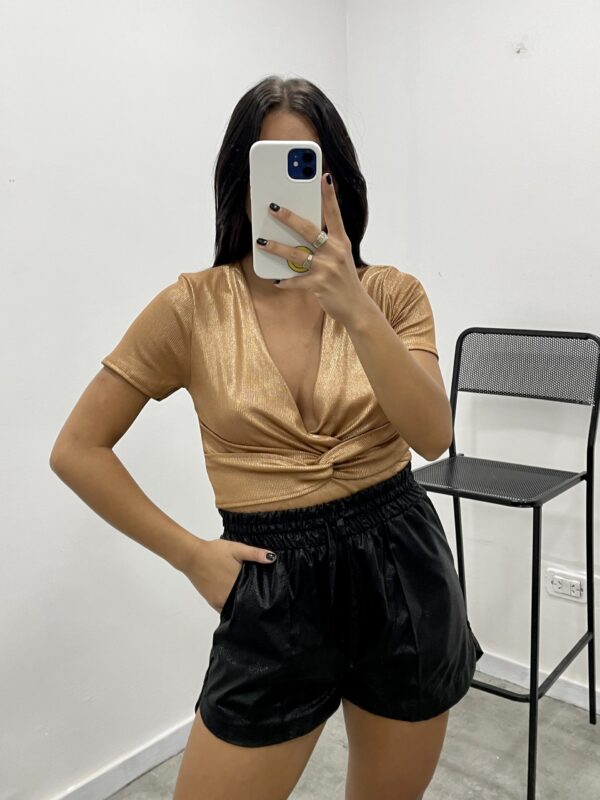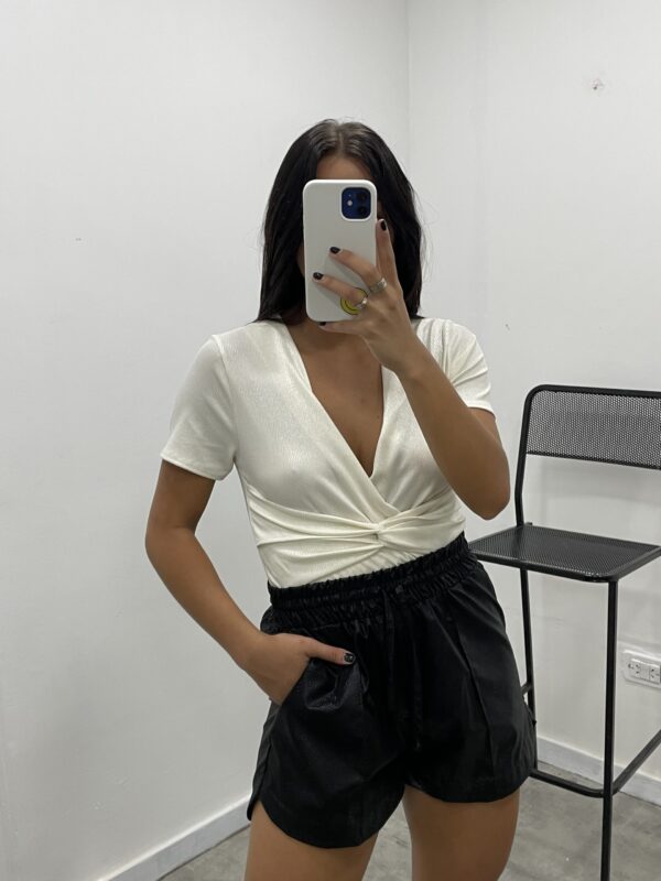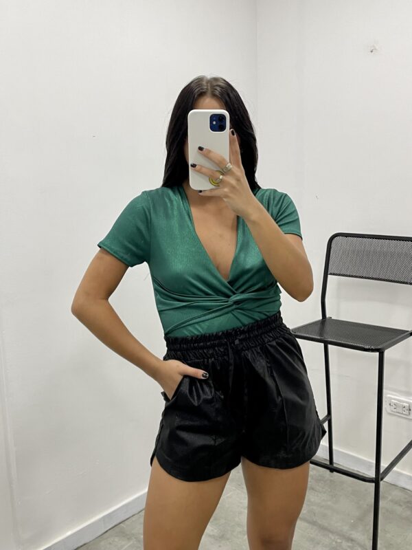 Body de tela metaliza con textura de morley, escotado y con frunce en el frente. Ganchitos abajo.