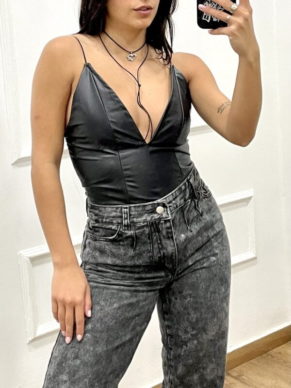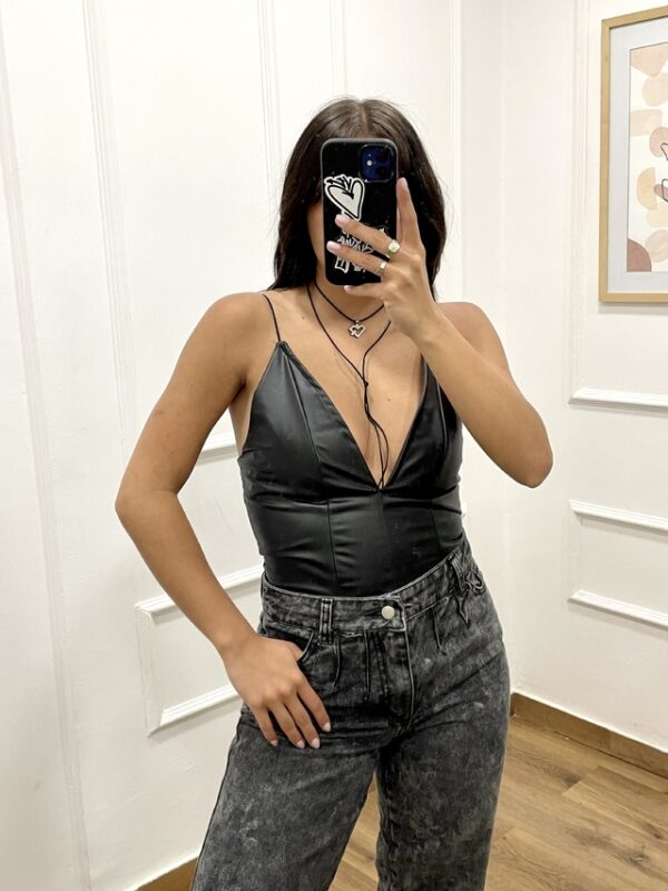 Body de eco cuero con escote en v y tiras de elásticas. Con ganchitos abajo.