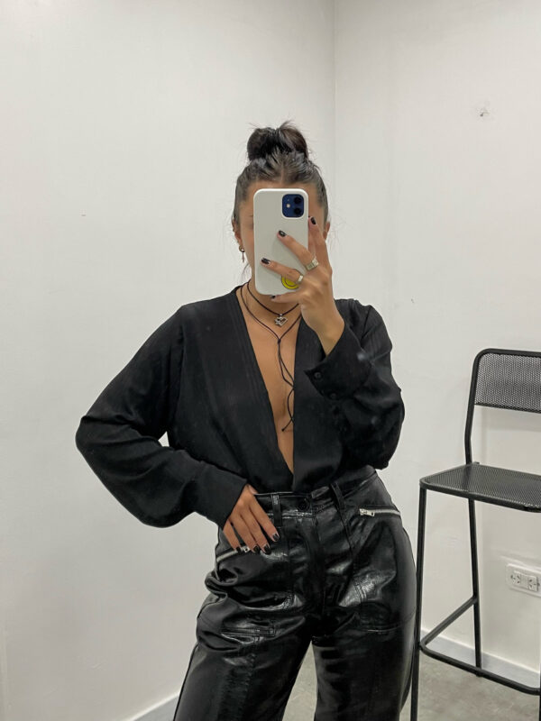 Body de gasa semi transparente con escote en V cruzado, con ganchitos abajo.