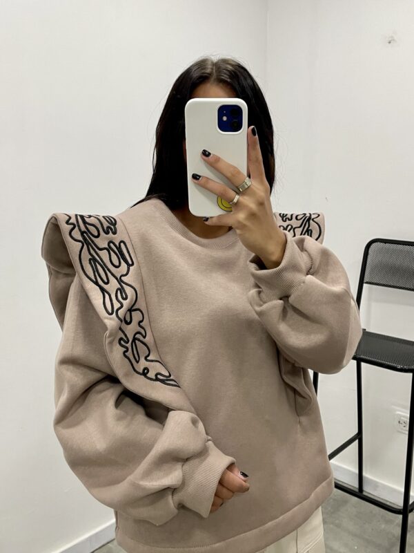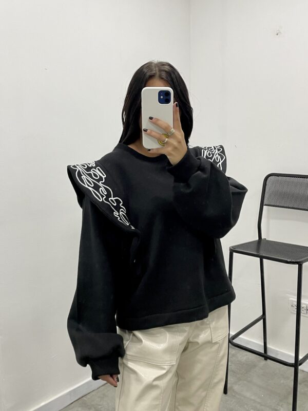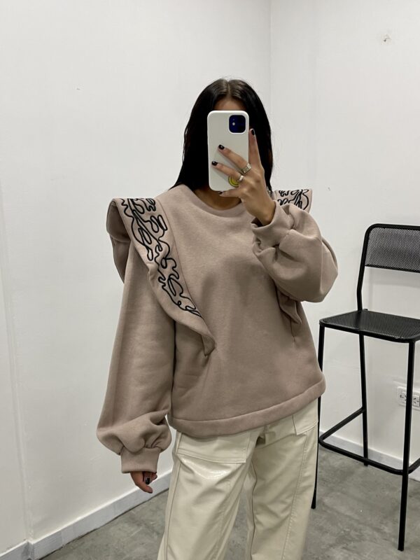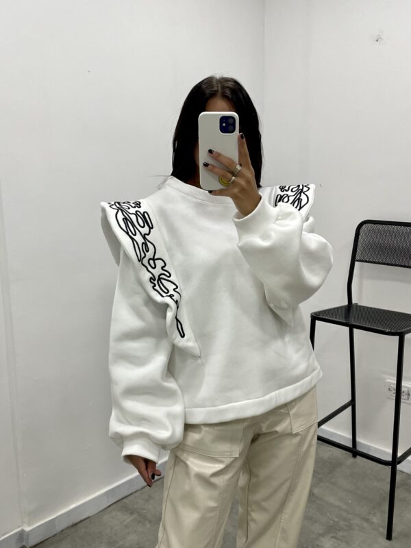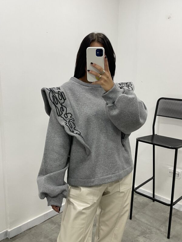 Buzo de frisa con cuello redondo y volados con bordado en el frente.