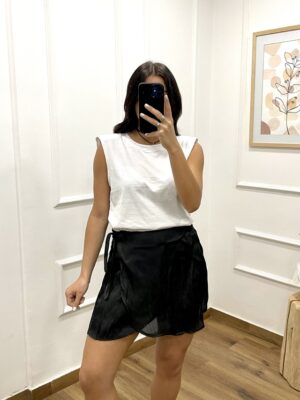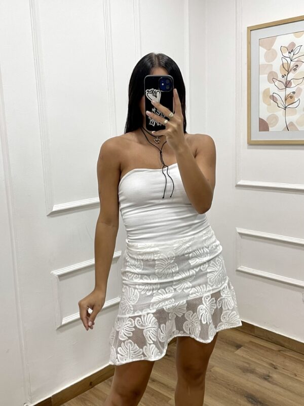 Mini de encaje con forro y volado irregular. Tiro medio/bajo.