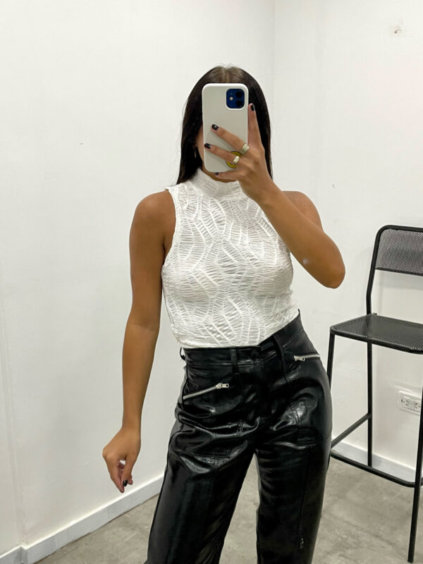Polera de tela texturada, al cuerpo, con cuello tortuga.