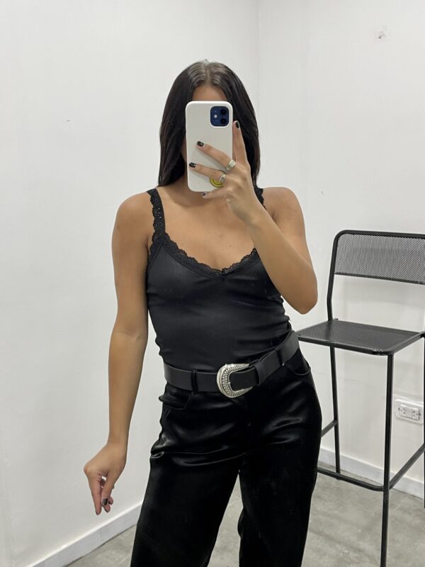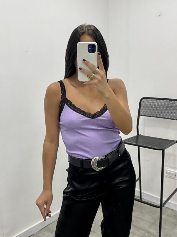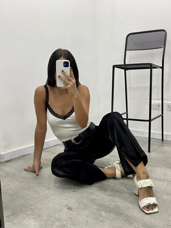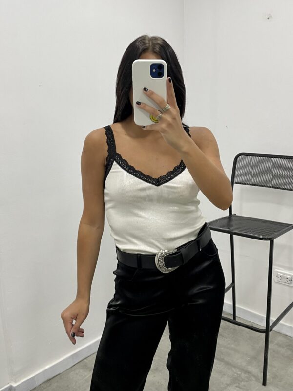 Musculosa de tela metalizada con textura de morley, escote en V y puntilla en los breteles y en el escote.