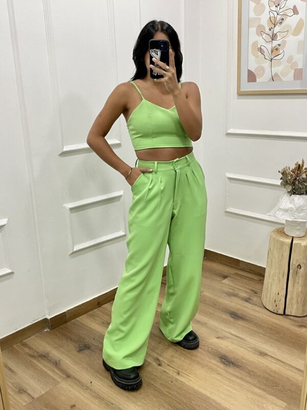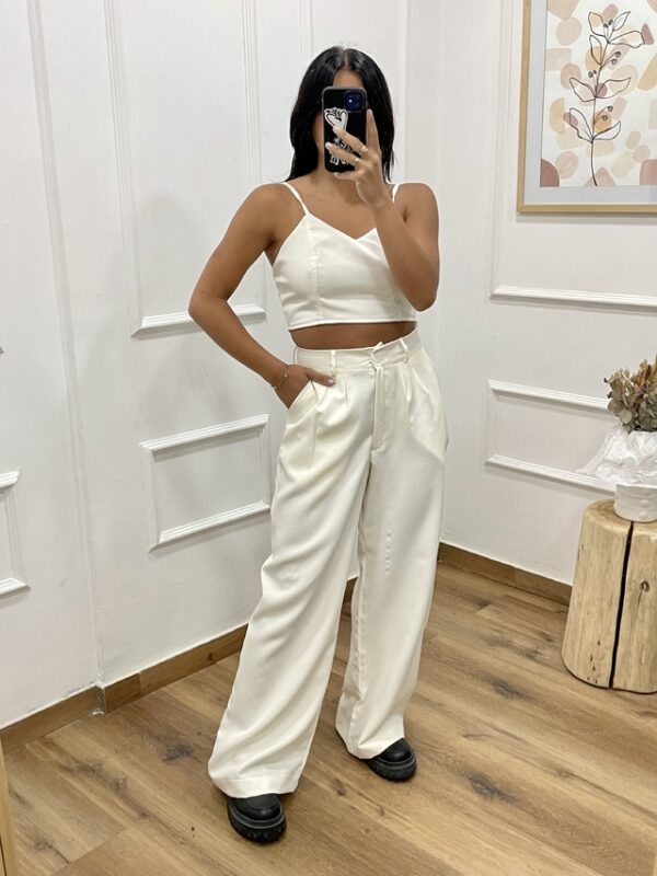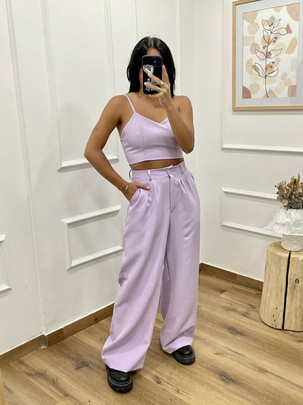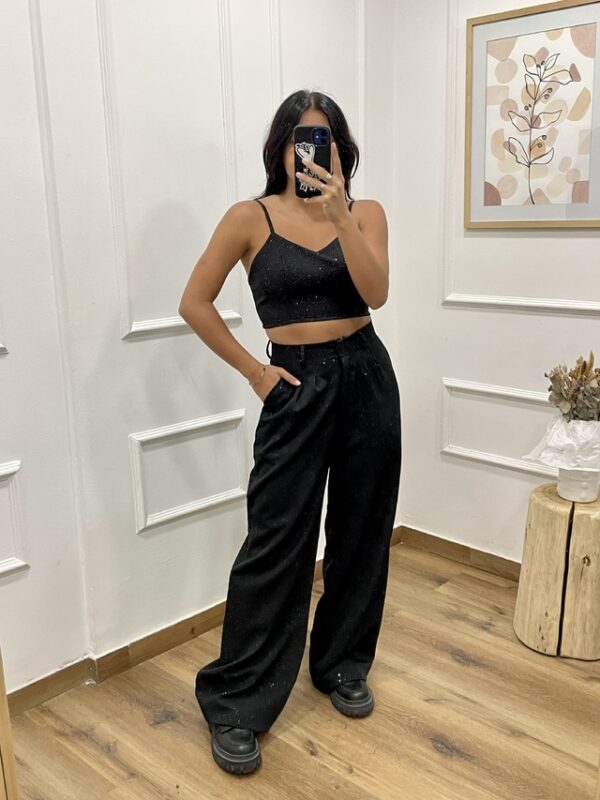 Pantalón sastrero de crep con brillo, bolsillos en el frente y cintura alta.