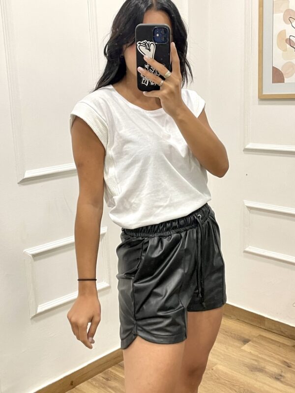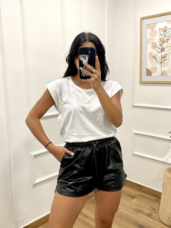 Short de eco cuero con elástico en la cintura, lazo regulable. Bolsillos y corte irregular en los costados.