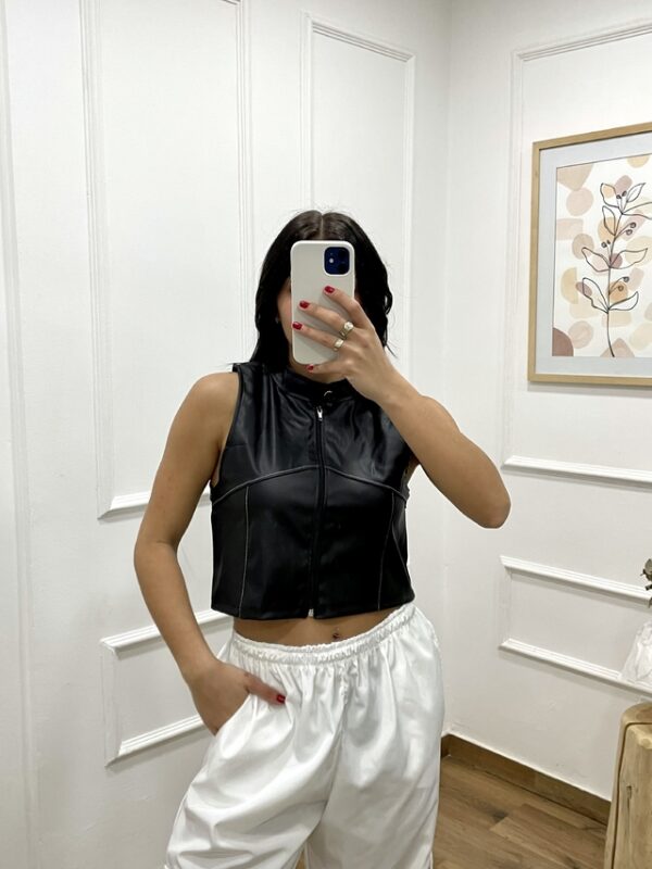 Top de eco cuero con escote cerrado, cierre en en frente y costuras a contra tono.