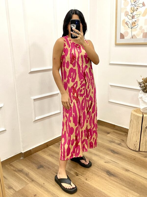 Vestido de morley largo estampado, con tajos en los laterales y apliques de lentejuelas.