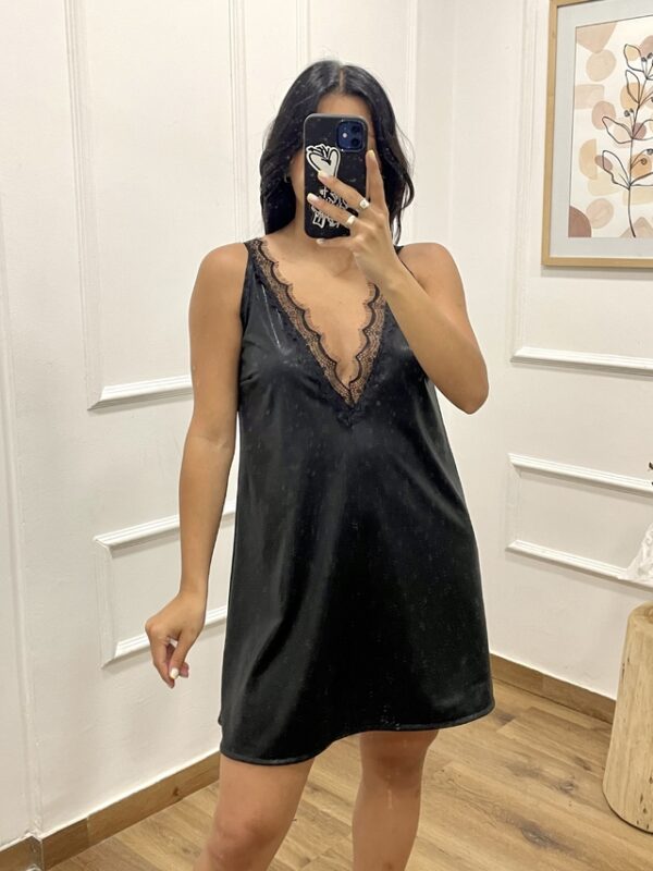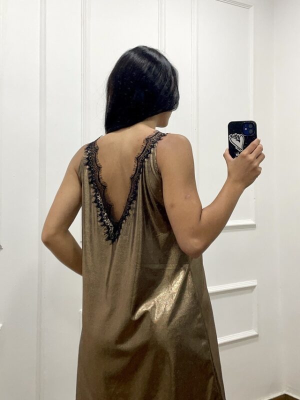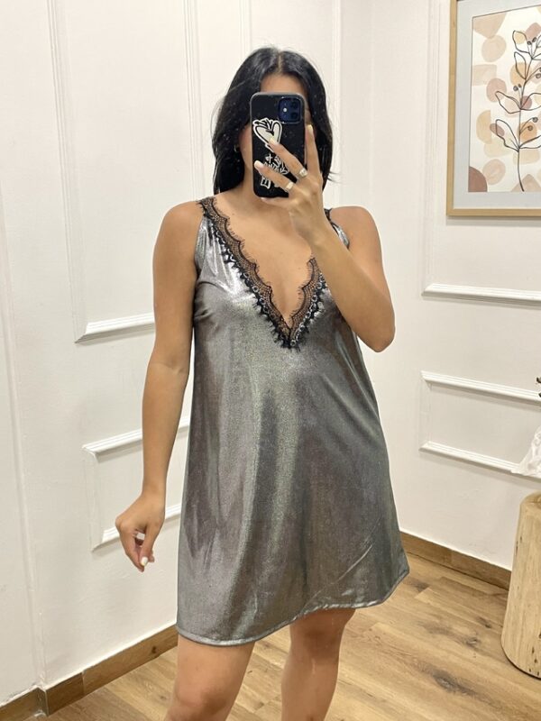 Vestido metalizada con escote en V y efecto buche, elástico en la cintura y manga corta.