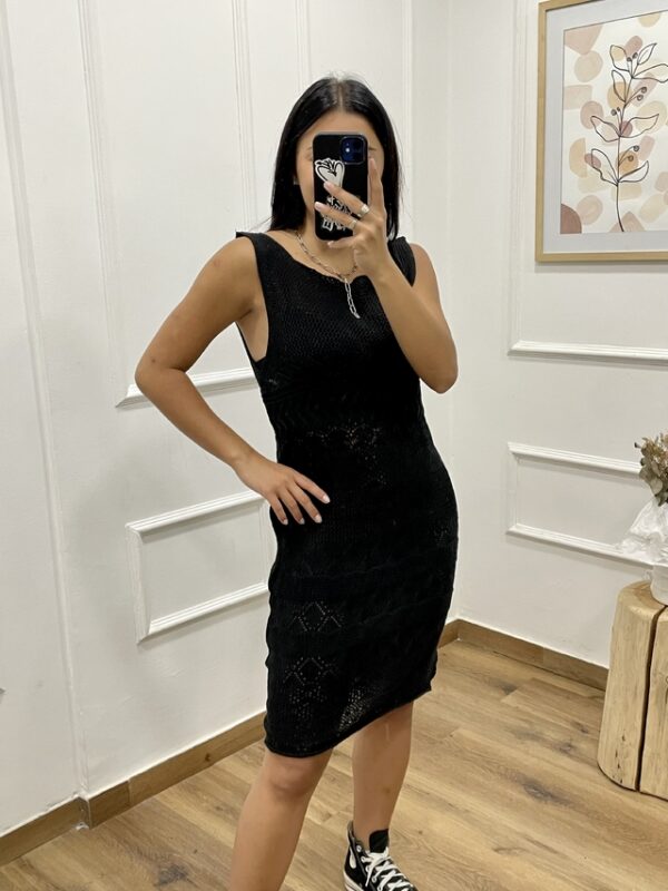 Vestido tejido con escote cerrado y largo por debajo de las rodillas.