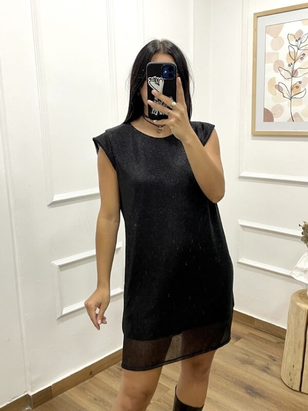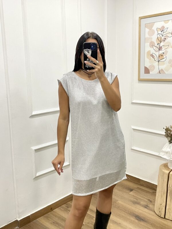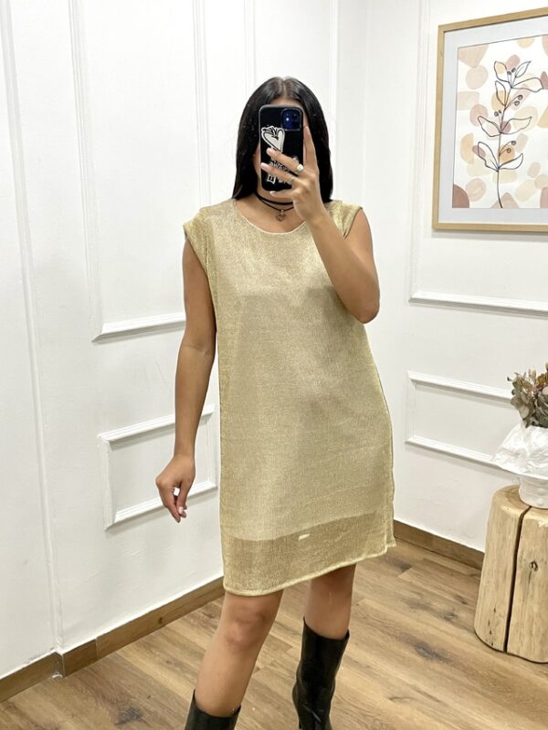 Vestido musculosa de red de lurex con recorte en los hombros y forro interno.