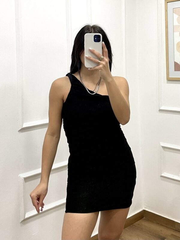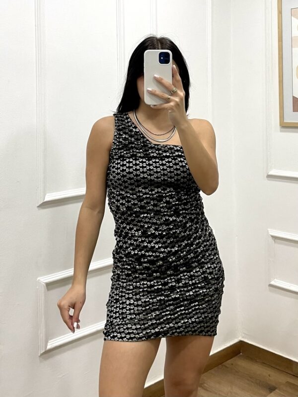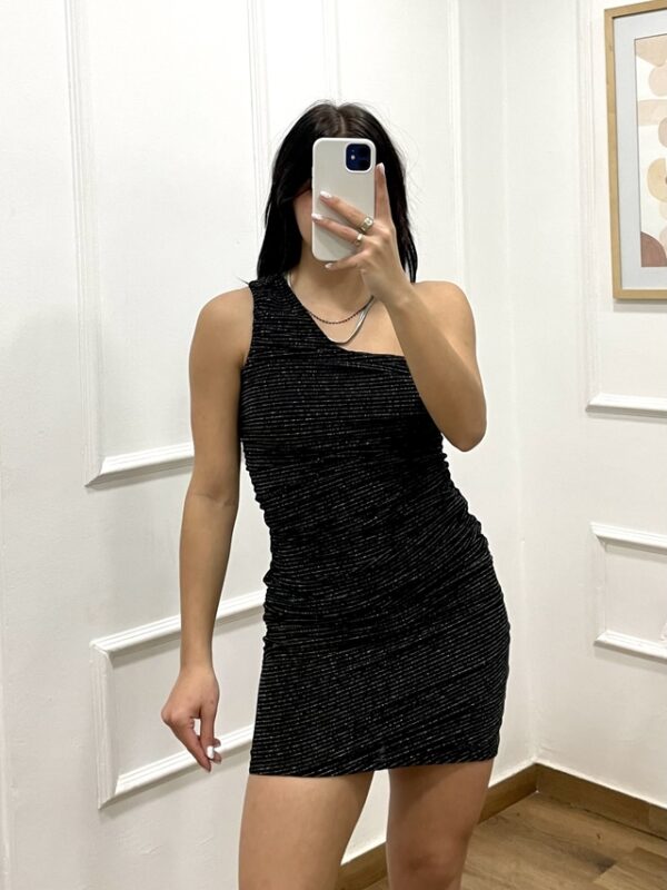 Vestido de lurex forrado en su interior con recorte irregular en la manga y frunce en los laterales.